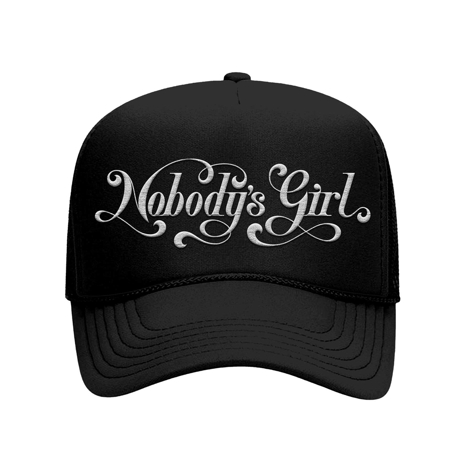 Nobody's Girl graphic embroidered on the front of a black, adjustable trucker hat.
